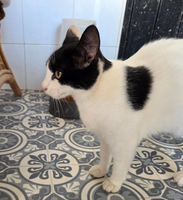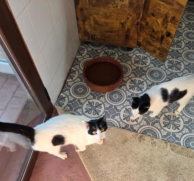 Hier waren sie von Anfang an lieb und freundlich. Man merkte ihnen an, dass sie aus einem Haushalt kamen. Wahrscheinlich wurde man sie nicht los, als sie ganz klein waren und so entledigte man sich der beiden halt in Form von Aussetzen. Glücklicherweise bemerkte es unser Mechaniker ehe seine Hunde den beiden Katzen etwas antun konnten.