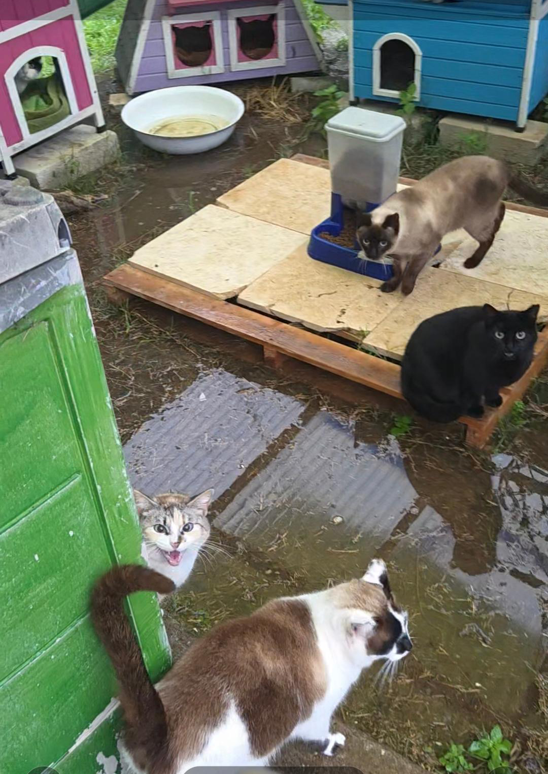 dass ich kein wasser über meinen grossen tank habe liegt übrigens daran, dass bei so einem wetter der zulauf im fluss, über den wir alle versorgt werden, manchmal verschüttet wird mit sand und grossen steinen. klar dieses mal ist wieder so und ich hatte den tank geleert, da wir arbeiten an den wasserrohren hatten. bis dieser flusszulauf wieder repariert werden kann wird es wochen dauern. denn der fluss muss dafür recht niedrig und ruhig sein. im moment ist er eher wie ein reissender wolf…. hier mal ein paar fotos von gestern. abgesehen von dem wo die katzen bei ihren häuschen auf futter warten. heute war ich bisher nur zum füttern in den katzenhäusern. fotos kann ich erst später machen wenn der sturm nachgelassen hat. das soll heute nachmittag sein.