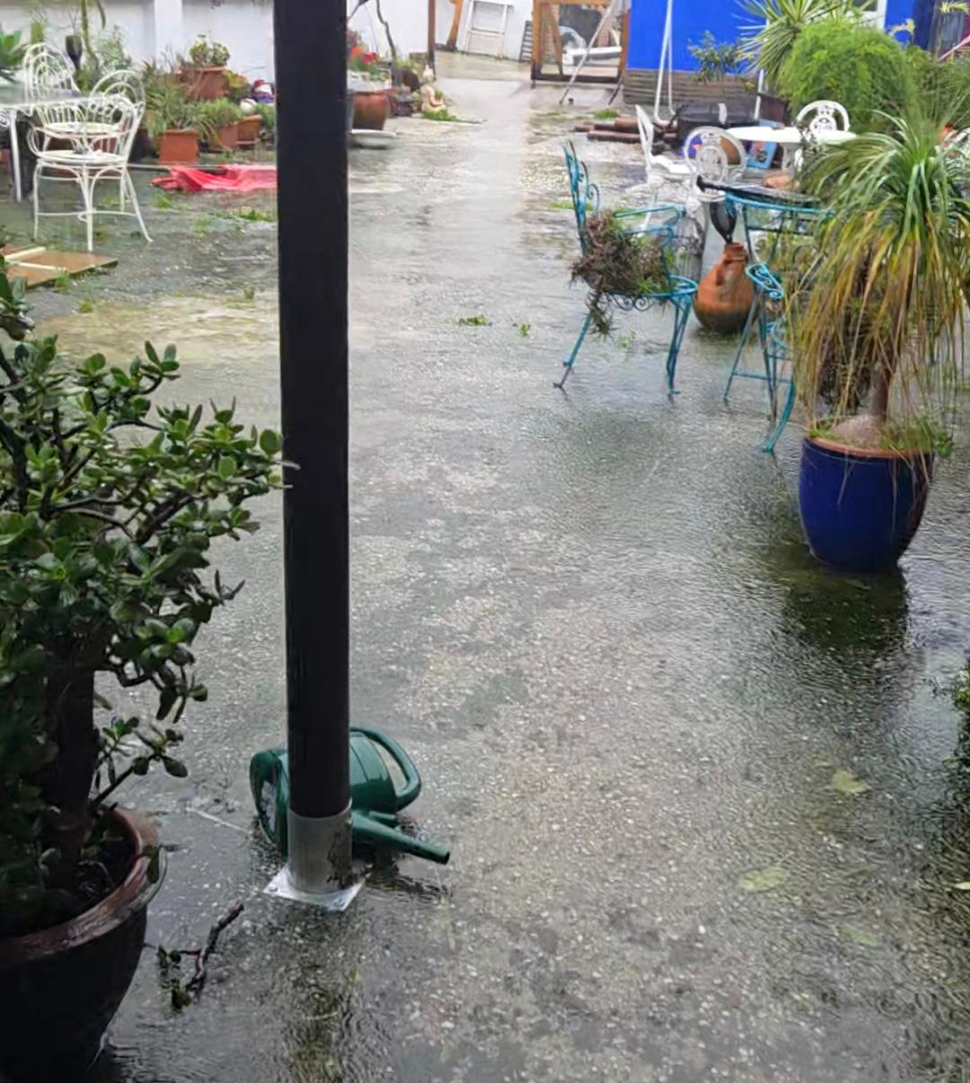 dass ich kein wasser über meinen grossen tank habe liegt übrigens daran, dass bei so einem wetter der zulauf im fluss, über den wir alle versorgt werden, manchmal verschüttet wird mit sand und grossen steinen. klar dieses mal ist wieder so und ich hatte den tank geleert, da wir arbeiten an den wasserrohren hatten. bis dieser flusszulauf wieder repariert werden kann wird es wochen dauern. denn der fluss muss dafür recht niedrig und ruhig sein. im moment ist er eher wie ein reissender wolf…. hier mal ein paar fotos von gestern. abgesehen von dem wo die katzen bei ihren häuschen auf futter warten. heute war ich bisher nur zum füttern in den katzenhäusern. fotos kann ich erst später machen wenn der sturm nachgelassen hat. das soll heute nachmittag sein.